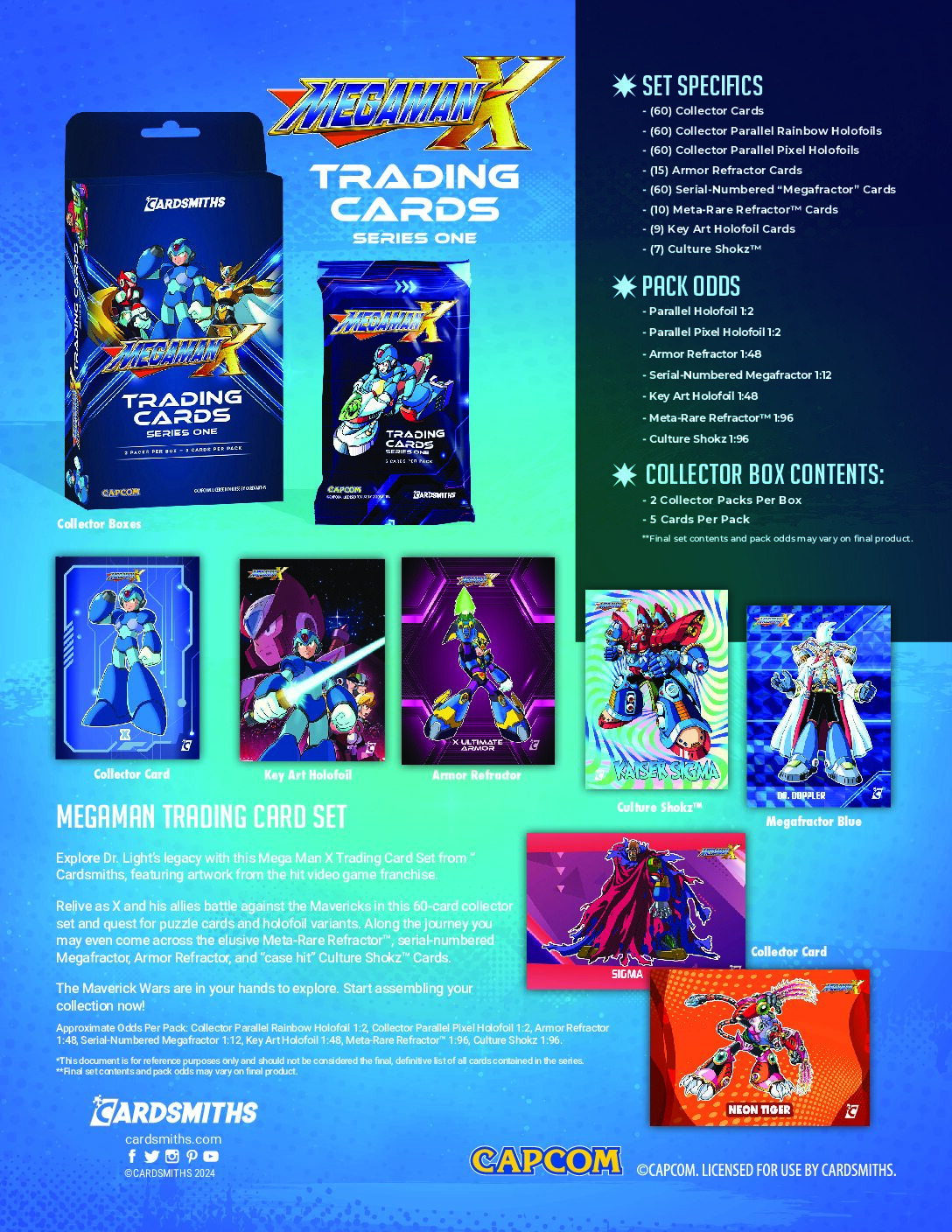 Relive as X and his allies battle against the Mavericks in this 60-card collector set and quest for puzzle cards and holofoil variants. Along the journey you may even come across the elusive Meta-Rare Refractor, serial-numbered Megafractor, Armor Refractor and “case hit” Culture Shokz cards.